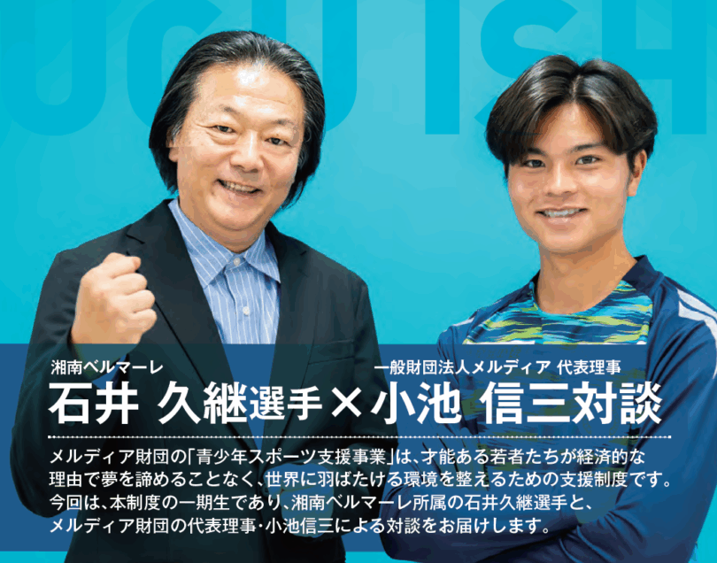 今回は、本制度の一期生であり、湘南ベルマーレ所属の石井久継選手と、メルディア財団の代表理事・小池信三による対談をお届けします。