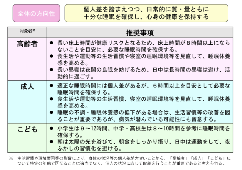 以下の図は、厚生労働省の睡眠対策として掲載があった「健康づくりのための睡眠ガイド2023」から抜粋いたしました。